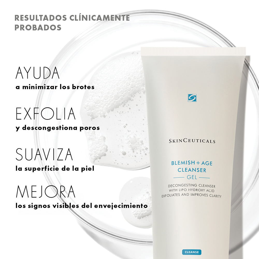 Blemish + Age Cleanser es un limpiador exfoliante dirigido con LHA/AHA/BHA que contiene un surfactante acondicionador y una concentración del 12% de ingredientes clave que combinan ácido lipo-hidroxi, ácido glicólico, ácido salicílico, glicerina y sorbitol para eliminar el exceso de aceites y maquillaje, al mismo tiempo que descongestiona los poros y aclara la piel. Es perfecto para pieles con signos de envejecimiento propensa a brotes, dado que refina suavemente la apariencia de los poros obstruidos y ayuda a reducir las imperfecciones sin resecar la piel.