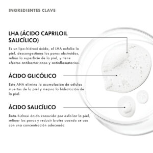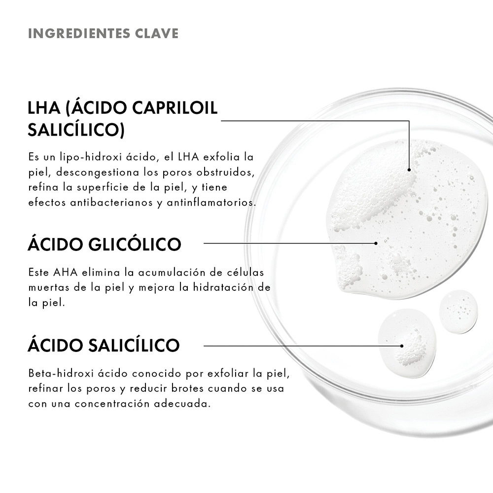 LHA (ácido capriloil salicílico): Es un lipo-hidroxi ácido, el LHA exfolia la piel, descongestiona los poros obstruidos, refina la superficie de la piel, y tiene efectos antibacterianos y antinflamatorios.