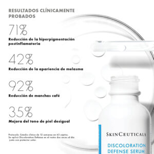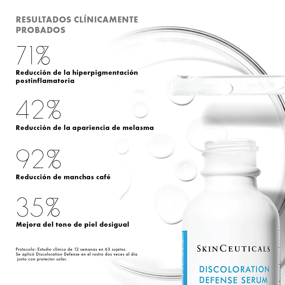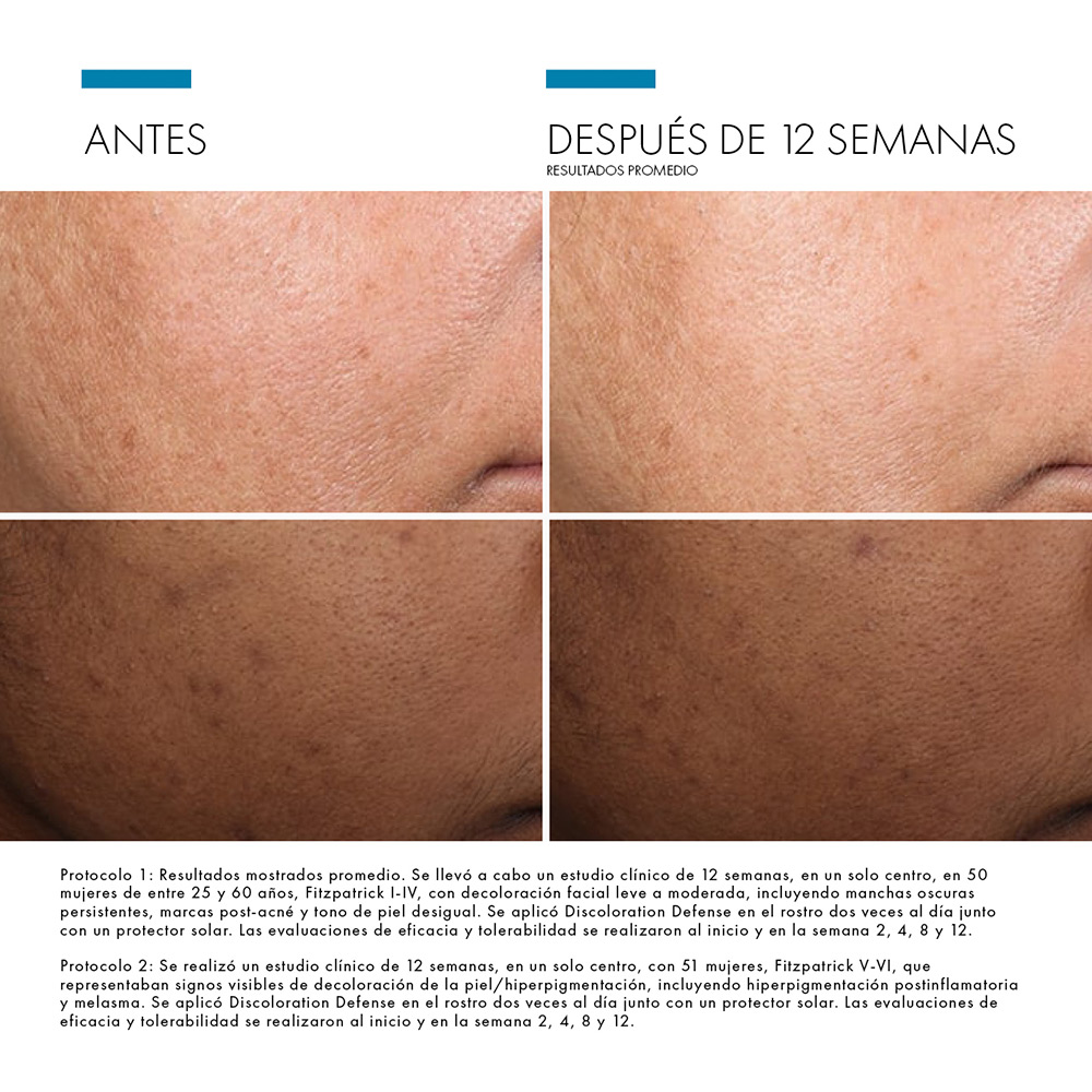 Discoloration Defense es un sérum corrector de manchas de uso diario, clínicamente demostrado que ayuda a reducir la apariencia de los principales tipos de hiperpigmentación de la piel en todos los tonos de piel, incluyendo manchas oscuras persistentes y marcas de imperfecciones. Formulado con un 3% de ácido tranexámico, un 1% de ácido kójico, un 5% de niacinamida y un 5% de HEPES, este sérum para manchas oscuras mejora la apariencia de la hiperpigmentación de la piel, ilumina la piel y unifica el tono de la piel en 12 semanas.