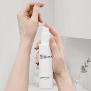 La piel de nuestro cuerpo es más gruesa que la del rostro, pero es igualmente vulnerable al envejecimiento. Por eso hemos creado el EGF Body Serum, con una alta concentración en EGF de cebada, para regenerar, reafirmar e hidratar la piel. Su fórmula, nada grasa, es extremadamente ligera y ha sido específicamente diseñada para extenderse fácilmente y absorberse aún más rápido, eliminando así los residuos antes de ponerse la ropa. Contiene agua pura islandesa filtrada geológicamente mediante lava inerte, ácido hialurónico, extracto de semilla de cebada y glicerina, entre otros, para revitalizar la piel, proporcionar hidratación a largo plazo y dejar la piel con una sensación suave y sedosa.