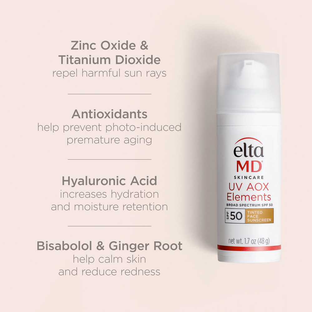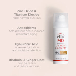 UV AOX Elements Broad-Spectrum SPF 50 es un protector solar hidratante enriquecido con antioxidantes y minerales puros. Contiene vitamina E, un poderoso antioxidante que neutraliza el daño de los radicales libres y favorece la reducción visible del fotoenvejecimiento de la piel. El fotoenvejecimiento de la piel produce líneas finas y arrugas, decoloración y una tez áspera y desigual. Ácido hialurónico que ayuda a hidratar y retener la humedad para una apariencia más juvenil. Bisabolol y extracto de raíz de jengibre para ayudar a calmar la piel irritada y reducir visiblemente el enrojecimiento.