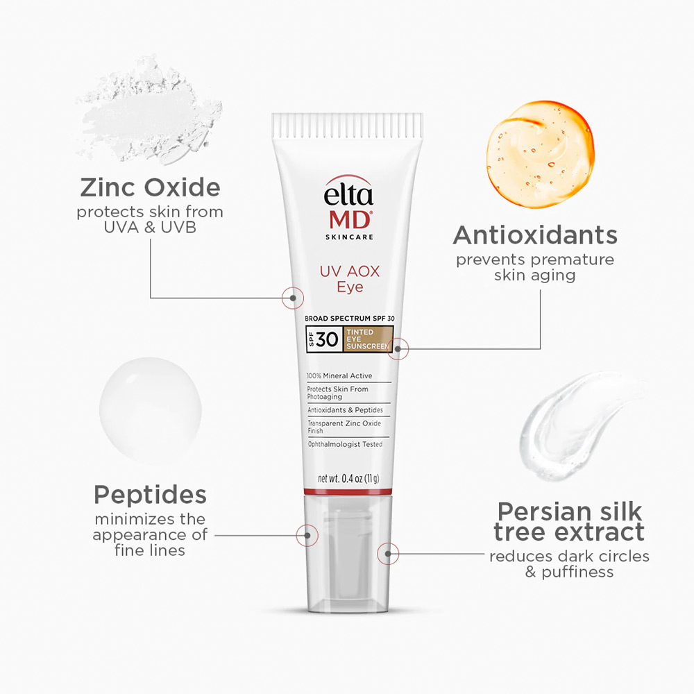 El protector solar UV AOX Eye Broad Spectrum SPF 30, ligero y rico en antioxidantes, protege la delicada piel del contorno de los ojos, minimiza los signos de las líneas finas e ilumina las ojeras. La fórmula hidratante, 100 % mineral y no irritante está enriquecida con una potente combinación de antioxidantes que rejuvenecen la piel para reparar y fortalecer la barrera cutánea, para lograr una piel más joven y saludable. Se ha demostrado que este protector solar con color reduce visiblemente los signos del envejecimiento prematuro y ayuda a corregir el tono de piel opaco y desigual. Este protector solar para el contorno de ojos se puede usar solo o debajo del maquillaje. (0,4 fl oz/11 g)