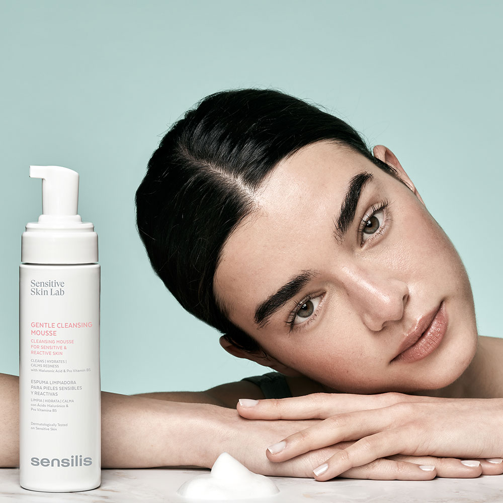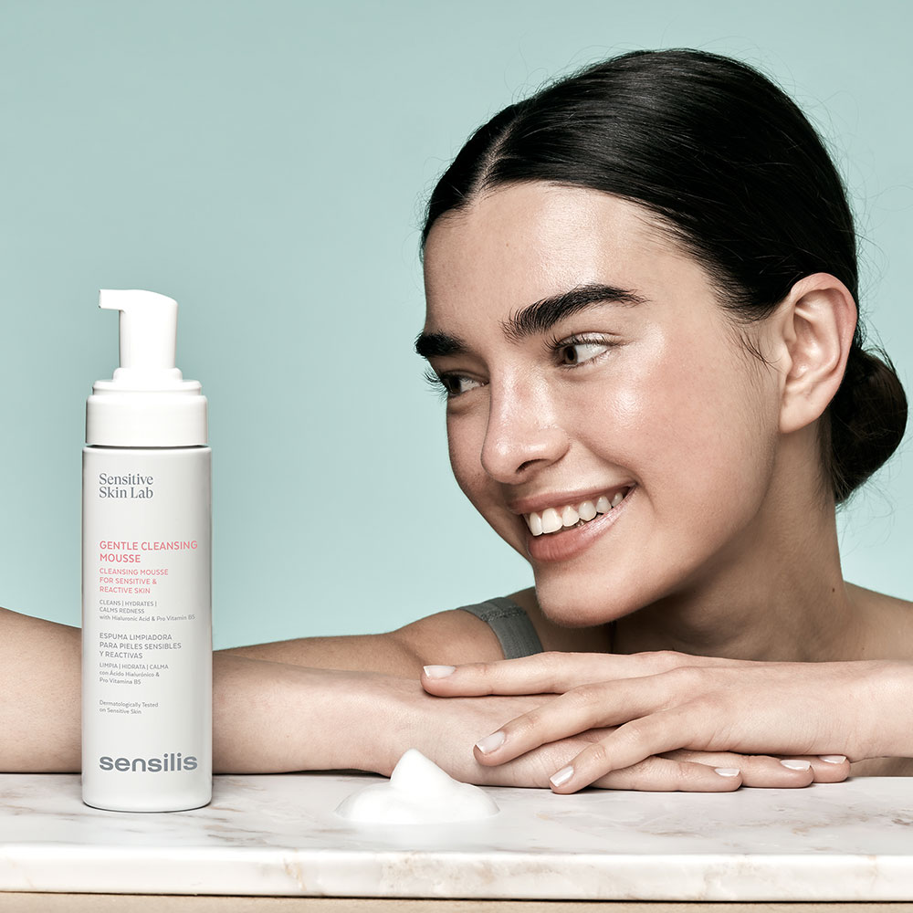 Espuma limpiadora con textura mousse para pieles sensibles y reactivas que hidrata y calma, respetando el ecosistema de la piel (microbiota, pH y manto lipídico).