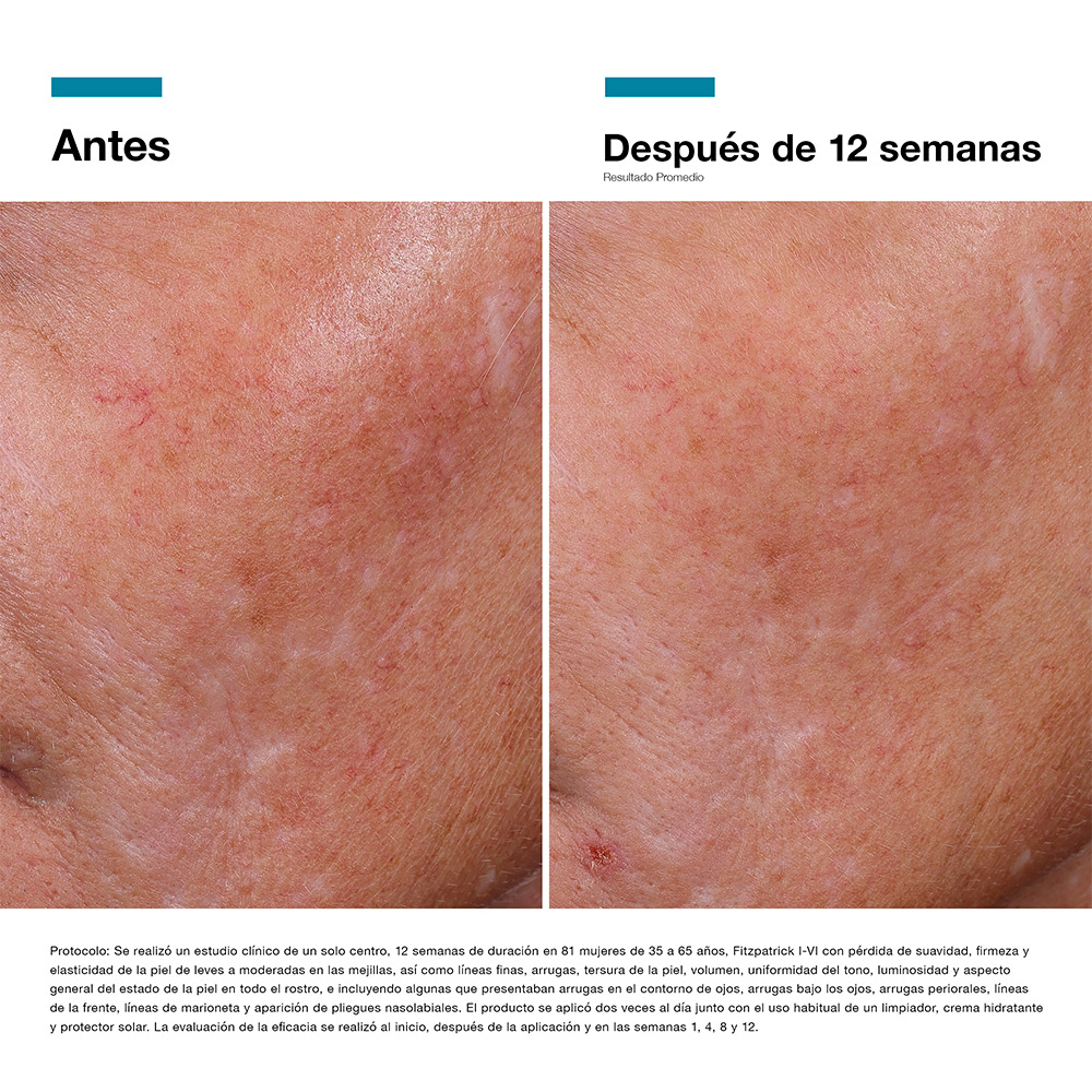 Resultados en 12 Semanas: Rellena visiblemente las líneas finas de expresión en un 24%. Entrega un efecto lifting facial global en un 7,7%