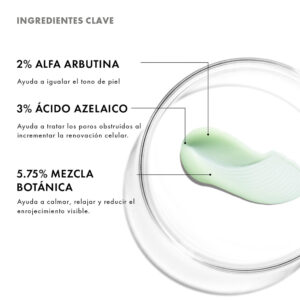 Aqua, Glicerina, Isononil Isononanoato, Propilenglicol, Ácido Azelaico, Niacinamida, Escualano, Alfa-arbutina, Poliacriloildimetiltaurato de Amonio, Poliisobuteno Hidrogenado, Sililato de Sílice, Hidroxiacetofenona, Hialuronato de Sodio, Caprililglicol, Acrilato de Hidroxietilo/copolímero de Acriloildimetiltaurato de Sodio, Sodio Hidróxido, Extracto de Hoja de Olea Europaea/extracto de Hoja de Olivo, Perfume/fragancia, Butilenglicol, Extracto de Hoja de Rosmarinus Officinalis/extracto de Hoja de Romero, Extracto de Fruta de Citrus Grandis/extracto de Fruta de Pomelo, Benzoato de Sodio, Extracto de Fruta de Cucumis Sativus/extracto de Fruta de Pepino, Isoestearato de Sorbitán , Polisorbato 60, Benzoato de Bencilo, Extracto de Flor/hoja de Thymus Vulgaris – Extracto de Flor/hoja de Tomillo, Ácido Láctico, Alcohol Bencílico, Ionona Alfa-isometilada, Linalol, Sorbato de Potasio, Citronelol, Extracto de Raíz de Morus Alba, Ci 19140/amarillo 5, Ci 42090 / Azul 1, Tocoferol, D278070/1.