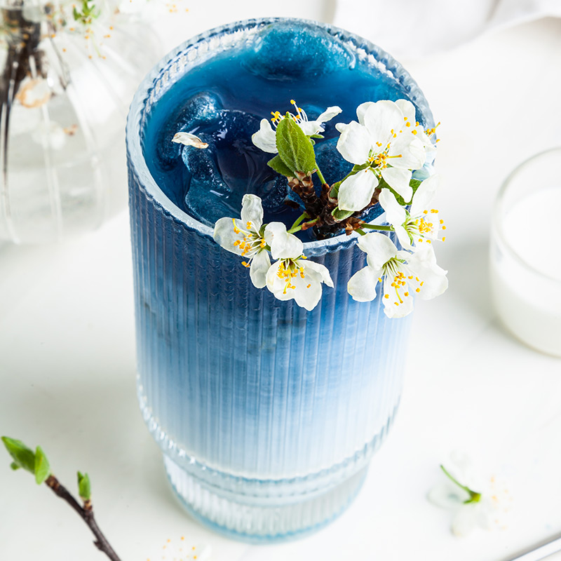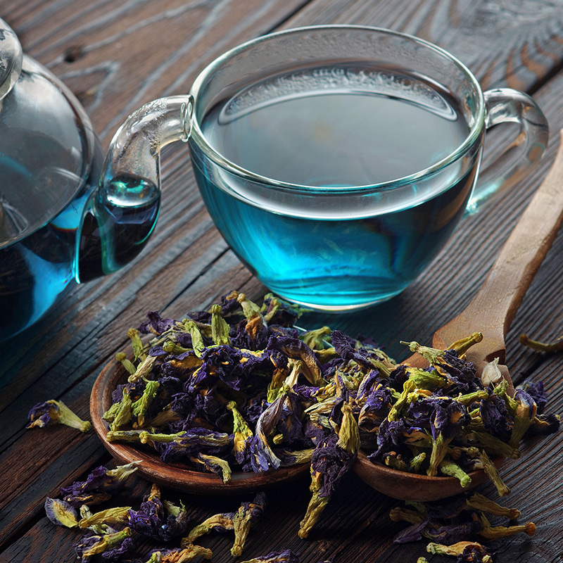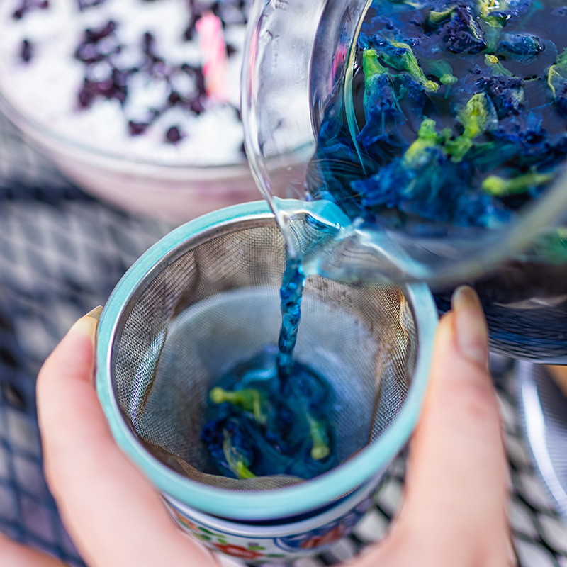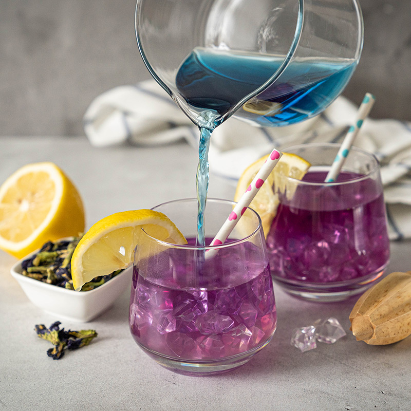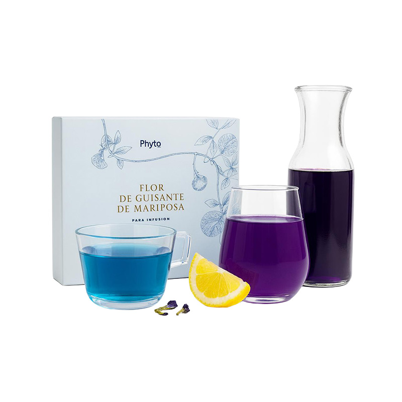 El té de guisante de mariposa se elabora a partir de las flores secas de la planta Clitoria ternatea, originaria del sudeste asiático. Esta planta es conocida por sus pétalos de un intenso color azul, que al infusionarse en agua caliente liberan un tono azul profundo y vibrante. Además, al añadirle unas gotas de limón o cualquier ingrediente ácido, el té cambia de color a un tono púrpura o rosado, lo que lo hace muy llamativo y popular en bebidas y cocteles naturales.